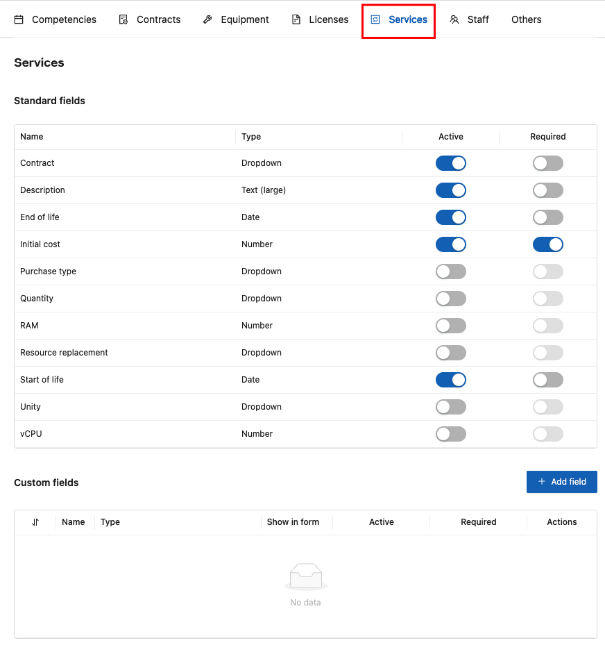2. In addition, the system allows you to add new custom service fields by clicking the “**Add field**” button: