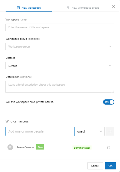 **Step 3**: In “New workspace” it is necessary to click on the button and enable it to be private, now it is possible to enter the name of the user who will have access to the Workspace, as in the example below: