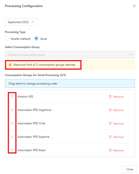 Permitir que o usuário defina a ordem de processamento entre grupos de consumo, evitando que cálculos dependentes sejam reprocessados múltiplas vezes ou incorretamente.